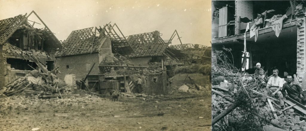 links: Häuserruinen in Oppau (IPGV, Fotosammlung) ; rechts: Familie in den Trümmern ihres Hauses (Stadtarchiv Ludwigshafen, Nachlass Hans Lutz, Nr. 42d/239)