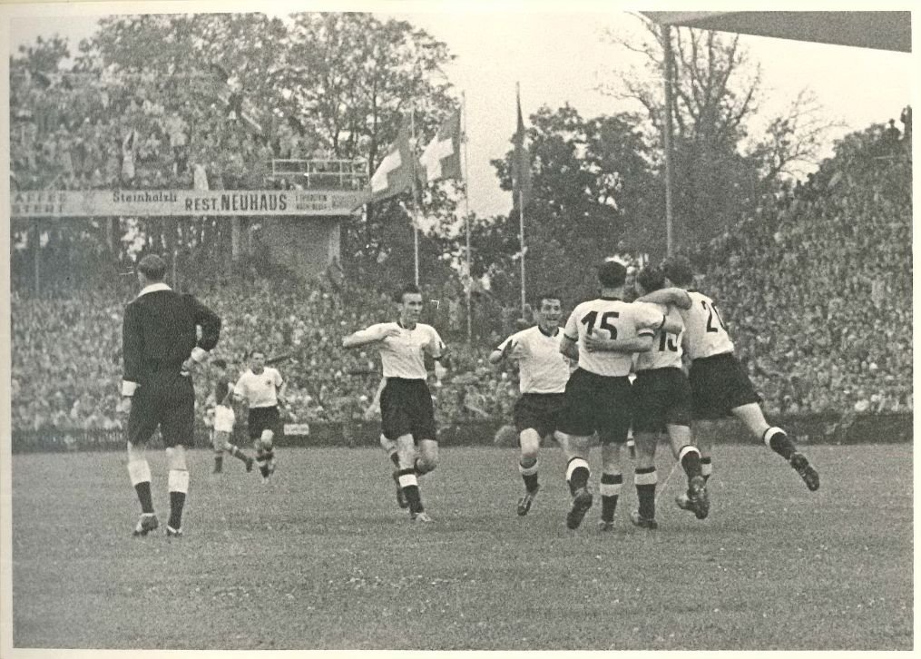 WM-Finale, Wankdorf-Stadion Bern, 4. Juli 1954: 84. Minute, Torjubel nach dem 3:2 - Mitte: Horst Eckel und Fritz Walter; von hinten: Ottmar Walter (Rückennr. 15), vermutl. Max Morlock [Nr. 13] und Hans Schäfer (Nr. 20); sich mglw. aus dem Hintergrund nähernd: Torschütze Helmut Rahn (Stadtarchiv Kaiserslautern, Fotoslg.)