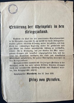 Weder zur Klärung der kritischen Fragen, noch zu einer final urteilenden Volksversammlung, wie es die provisorische Regierung versprochen hatte, ist es in der Pfalz gekommen. Stattdessen überschritten am 13. Juni 1849 Teile der preußischen Armee die Grenze zur Pfalz. Um auf eine feindliche Invasion vorbereitet zu sein, hatte die provisorische Regierung bereits am 8. Juni den Kriegszustand ausgerufen. Ein Gefecht mit bewaffneten Truppen bei Kirchheimbolanden am 14. Juni lieferte dem Oberkommandierenden der Preußen, dem späteren König und Kaiser Wilhelm I. (1797–1888) den Vorwand, seinerseits den Kriegszustand über die Pfalz zu erklären und militärisch hart durchzugreifen.*