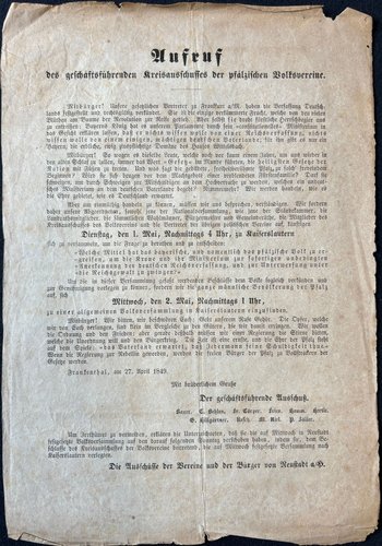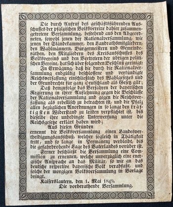 Daher wurde für den 1. Mai, einem Dienstag, nach Kaiserslautern eingeladen, um dort in einer vorbereitenden Versammlung zu beraten, welche Mittel das bayrische und besonders »das pfälzische Volk zu ergreifen [habe], um die Krone und ihr Ministerium zur sofortigen unbedingten Anerkennung der deutschen Reichsverfassung, und zur Unterwerfung unter die Reichsgewalt zu zwingen.« (Q1)