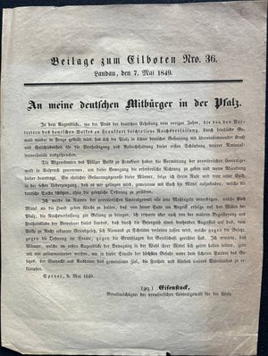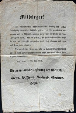 Eine derartige Übernahme war in Kaiserslautern geschehen, aber auch in Frankenthal, dessen Vorstand im April 1849 turnusgemäß den geschäftsführenden Kreisausschuss leitete. Deswegen ging die Reaktion auf die bayrische Ablehnung der Reichsverfassung von Frankenthal aus: Der bayrische König und alle deutschen Fürsten würden »die heiligsten Gesetze der Nation mit Füßen […] treten« (Q1) und damit Hochverrat begehen.