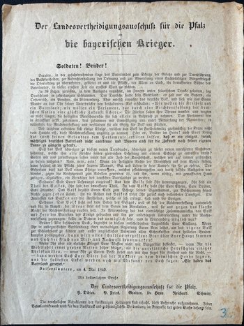 In einer seiner ersten Veröffentlichungen (Q3) versuchte der LVA die von Alwens gesehene Schwachstelle, die lokale Verbundenheit der pfälzischen Soldaten, zu nutzen: Soldaten sollten nicht gegen das eigene Volk, ihre Brüder und Familien für eine meineidige und verblendete Regierung kämpfen. Aus Sicht der Aufständischen wird in diesem Flugblatt die Genese des Gesamtkonfliktes seit Anfang des Jahres 1848 skizziert. Aus dieser Darstellung geht eindrucksvoll das neue Selbstverständnis der bürgerlichen Schicht der damaligen Zeit hervor: Das Volk habe den Königen »im Freiheitsmärz großmüthig die Krone nicht vom Haupte« gerissen »[u]nd trotzdem erfrechen sich« diese nun, die »Reichsverfassung für ungültig zu nennen.« Das Volk dürfe »zu diesem neuen Treuebruche« und »zu dieser neuen unerhörten Rechtsverhöhnung« nicht schweigen und dürfe sich nicht »zurückbeugen lassen unter das alte Joch der Knechtschaft, welches wir auf immer zerbrochen zu haben wähnten« (Q3). Hier trifft das moderne Verständnis der Volkssouveränität, das während der Zeit der Aufklärung entstand und sich in der amerikanischen Unabhängigkeit sowie der Französischen Revolution quasi manifestierte, auf die alte Vorstellung der königlichen Herrschaft.